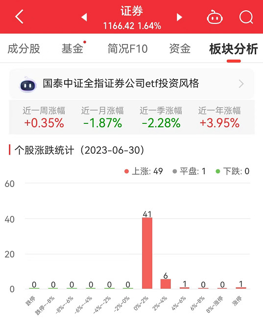 今日,证券板块整体涨幅1.64%,其中,49只股票上涨,1只股票平盘。