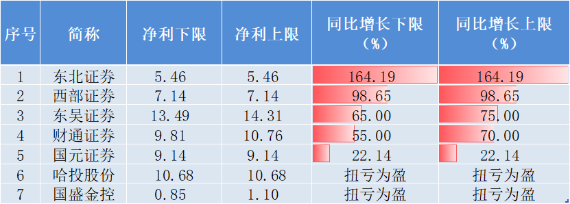 业绩层面上,随着中报季拉开帷幕,截至目前已有7家上市证券公司发布业绩预报或快报,全部实现较大幅度业绩增长。其中东北证券业绩快报显示,其上半年实现归母净利润5.46亿元,同比增加164%,暂居利润涨幅榜首位,西部证券同比大增近99%次之,东吴证券、财通证券同比增幅均在55%以上,国元证券同比增长22%,另外哈投股份、国盛金控实现扭亏为盈。