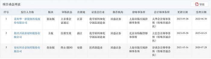 根据统计显示,2023年来,国盛证券所涉项目总计募集资金15.24亿元,排名46位,其中首发一家兴欣新材(001358.SZ)已上市。在排队的首发企业中,由国盛证券保荐的苏州华一新能源科技股份有限公司已过会。终止的项目有安庆回音必制药股份有限公司,以及冲锋北交所的中瑞医药(839574.NQ)。