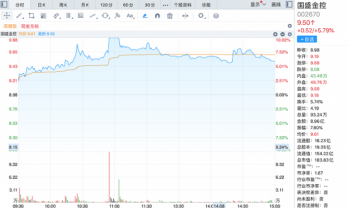 1月15日盘中,国盛金控(002670.SZ)的股价一度涨停。时间点是上午10点55分,一波买单集中出现,将国盛金控股价推至涨停板位置。不过涨停板维系约10分钟开板后,股价高位横向运行,最终收盘时,国盛金控的涨幅有5.79%,全天换手率5.74%,成交额约9亿元。