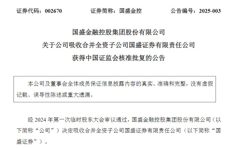 2月19日晚间,国盛金控发布公告称,公司于当日收到中国证监会出具的批复文件,核准国盛金控吸收合并国盛证券,吸收合并完成后,国盛证券解散,国盛金控名称变更为新国盛证券。