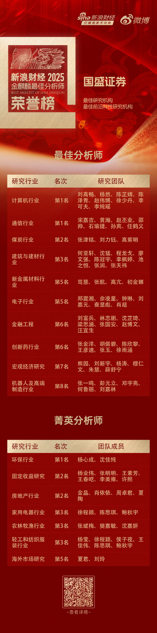 11月28日,第七届新浪财经金麒麟最佳分析师评选结果揭晓, 国盛证券 研究团队荣获“最佳研究机构第九名”、“最佳前沿科技研究机构第三名”。