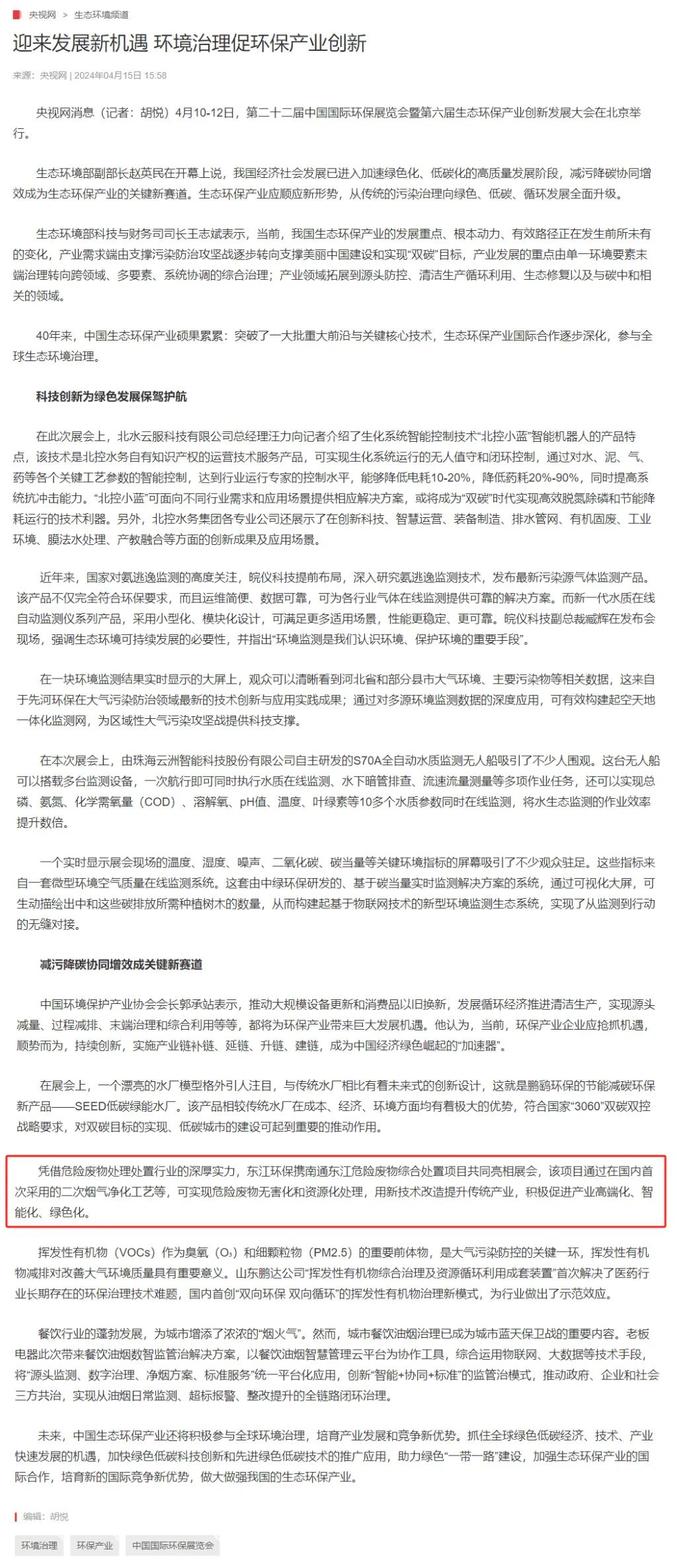 4月15日,央视网生态环境频道发布《迎来发展新机遇环境治理促环保产业创新》文章,报道第二十二届中国国际环保展览会暨第六届生态环保产业创新发展大会盛况,文中谈及“减污降碳协同增效成关键新赛道”时“点赞”东江环保,积极评价企业在危险废物处理处置行业深厚实力。东江环保作为国内工业危险废物处理行业的领军企业,始终坚守“践行生态文明、服务美丽中国”的企业使命,业务链横跨工业固、危废资源化利用和无害化处置、生态环境服务、智慧环保三大领域,配套发展一站式环保管家服务,具备44类危险废物经营资质,是国内危废处理资质最齐全的企业之一,年危废处置能力超280万吨,已实现危险废物全过程数字化精细化智能化管理,累计服务客户超2万家。当前,随着美丽中国建设全面推进,东江环保紧扣国家战略需求,时刻秉承绿色发展的理念与决心,牢牢把握站在人与自然和谐共生的高度谋划发展,以“成为各级政府、园区企业最优质的环境服务商”为全新定位,以强化科技创新和政策协同“双向发力”,加快朝向构建跨领域、多要素、系统治理的“大环保”战略发展格局迈进,努力为我国生态环保产业发展和经济绿色崛起不断注入新动力。