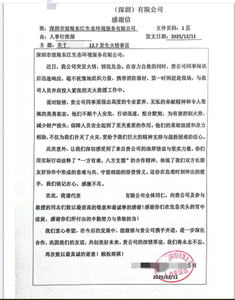 客户企业为此专程发来感谢信,并在全体员工大会上,对前海东江的优质服务及两位员工的出色表现予以公开表彰。此次火情的成功处置,彰显了东江环保员工的专业素养与英勇精神,也是对东江环保长期以来坚持高标准安全管理体系、强化员工安全培训与应急能力建设成效的一次实战检验。