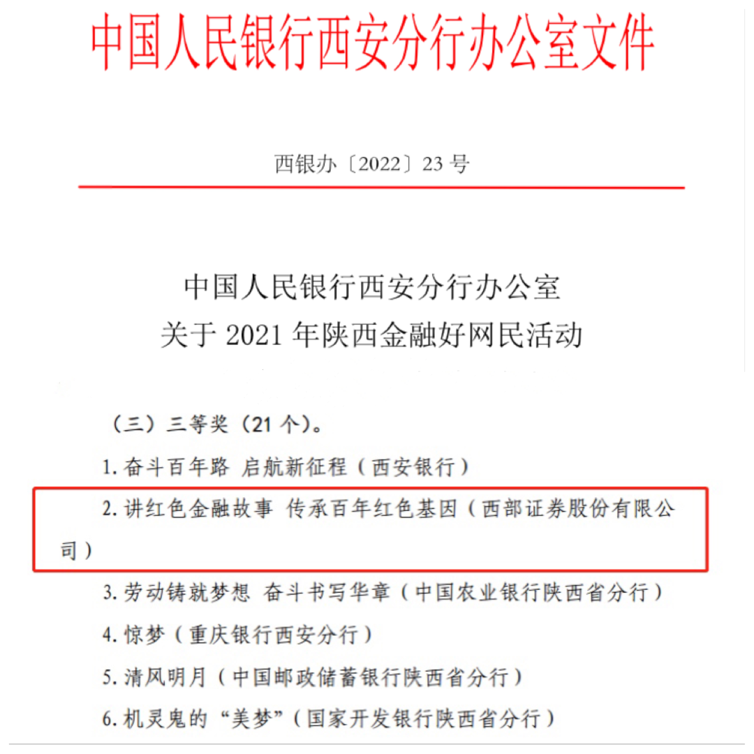 根据中央网信办2021年争做中国好网民工程总结部署视频会议精神,陕西省委网信办、人民银行西安分行等七部门联合举办“传递时代正能量争做陕西好网民”2021陕西好网民活动,西部证券响应活动号召,组织并报送优秀参赛作品。活动共计69家单位参加,收集128部优秀原创微视频作品,通过平台展播及全民投票,西部证券选送作品获三等奖奖项。