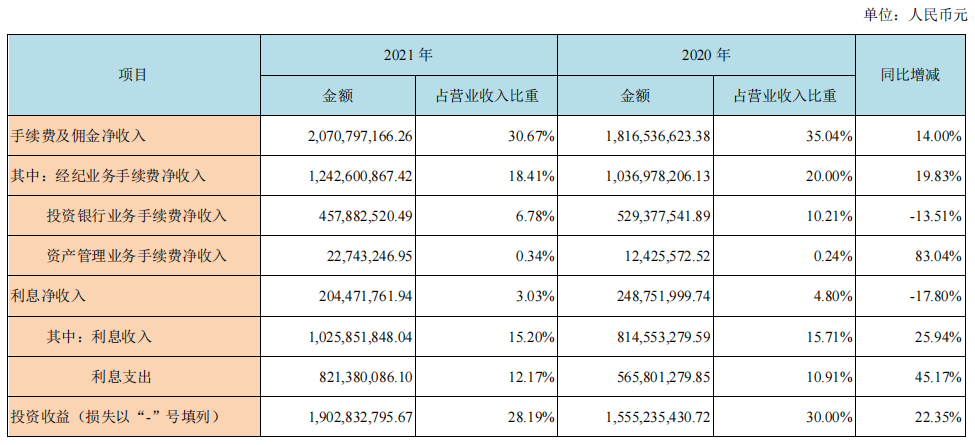 从收入构成来看,2021年该公司经纪业务手续费净收入同比增加19.83%至12.43亿元;投资银行业务净收入同比减少13.51%至4.58亿元;资产管理业务手续费净收入同比增加83.04%至2274.32万元。