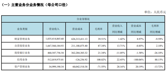 主营业务分行业来看,西部证券财富管理业务营业收入10.35亿元,同比增1.42%,毛利率39.51%,同比降9.59个百分点;自营投资业务营业收入16.68亿元,同比增13.71%,毛利率87.34%,同比增2.18个百分点;投资银行业务营业收入4.61亿元,同比降11.05%,毛利率21.34%,同比降26.18个百分点;信用业务营业收入5.12亿元,同比增22.45%,毛利率100.02%,同比增88.15个百分点;资产管理业务营业收入3499.92万元,同比增28.16%,毛利率-71.55%,同比降13.72个百分点。