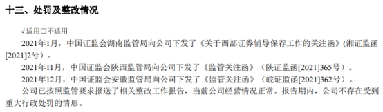 年报显示,2021年,西部证券受到处罚共计3次。西部证券表示,公司已按照监管要求报送了相关整改工作报告,当前公司经营情况正常。