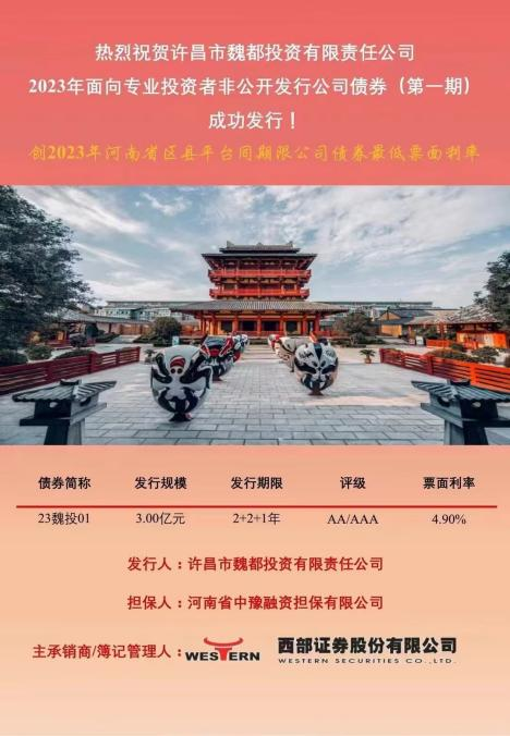 3、发行利率低:在近期发行的项目中,一是12月4日为咸阳金控发行的“23咸金05”,发行规模5亿元,期限2+1年期,票面利率4.44%,全场倍数3.24倍,票面利率创2017年以来陕西省同品种同评级同期限最低发行利率。二是“西部证券-陕投城市运营信息大厦资产支持专项计划”,规模8.01亿元,全场认购倍数33.6倍,优先级利率3.29%,创西北五省CMBS历史最低发行利率。在全国范围内也是如此,“许昌市魏都投资有限责任公司2023年面向专业投资者非公开发行公司债券(第一期)”,发行规模3亿元,票面利率4.90%,创2023年河南省区县平台同期限公司债券最低票面利率。