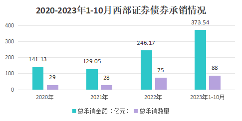 数据显示,2023年1-10月西部证券累计发行债券数量88只,总承销金额373.54亿元,平均承销额4.24亿元,总承销在全国券商排名第38。