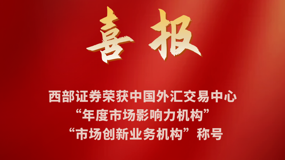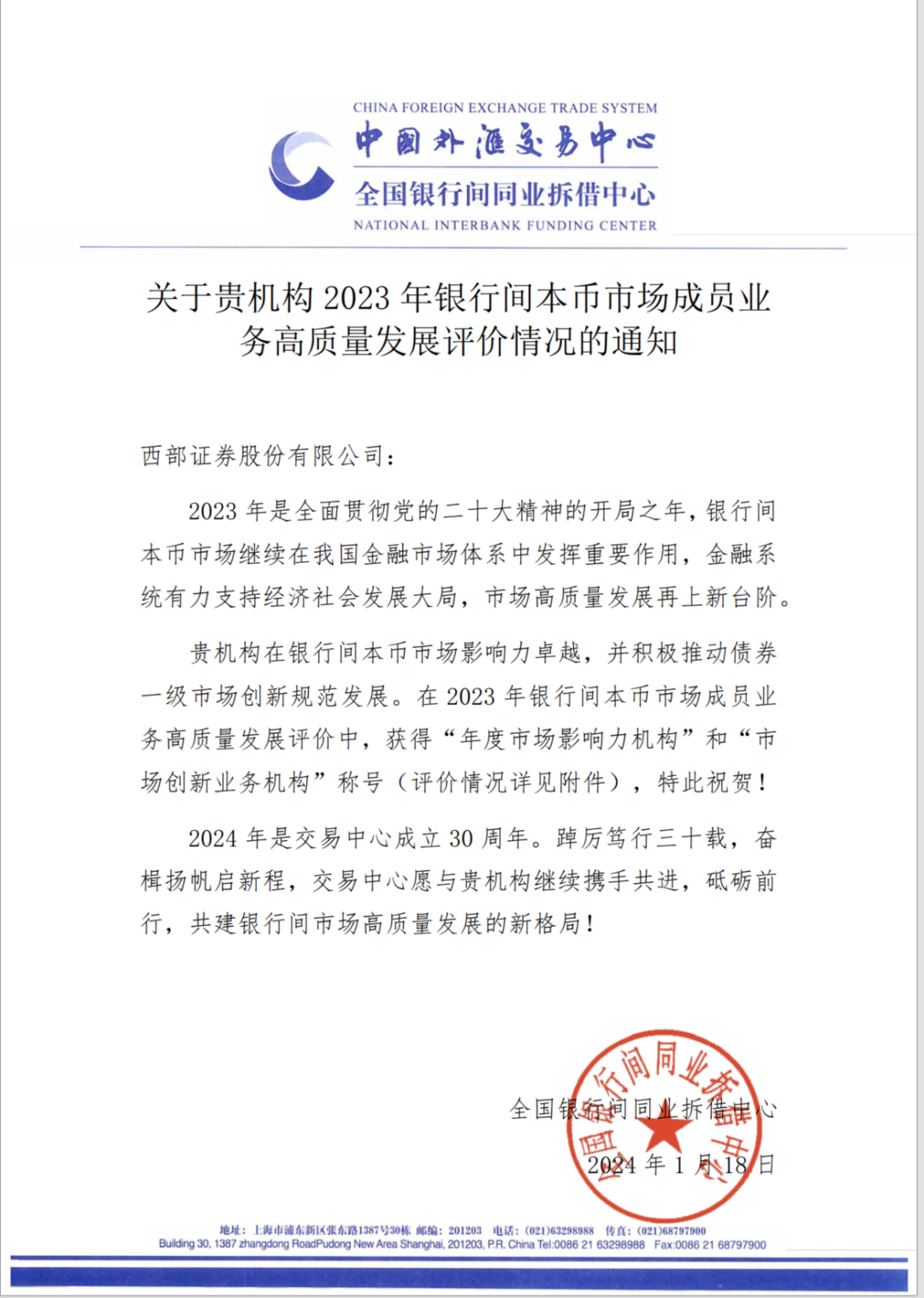 近日,中国外汇交易中心发布《关于发布2023年度银行间本币市场成员业务高质量发展评价结果的公告》,西部证券在2023年银行间本币市场成员业务高质量发展评价中,荣获“年度市场影响力机构-活跃交易商”和“市场创新业务机构-券商短融发行”称号。