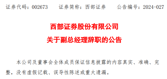 西部证券股份有限公司(以下简称“公司”)董事会于近日收到副总经理范江峰先生的书面辞职报告,范江峰先生因工作原因申请辞去公司副总经理职务,辞职后将不再担任公司任何职务。截至本公告披露日,范江峰先生未持有公司股票。辞职报告自送达公司董事会之日起生效,其辞职不会影响公司相关经营工作正常开展。