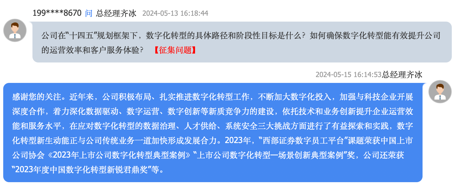 2023年,公司“西部证券数字员工平台”课题荣获中国上市公司协会《2023年上市公司数字化转型典型案例》“上市公司数字化转型—场景创新典型案例”奖,公司还荣获“2023年度中国数字化转型新锐君鼎奖”等,充分证明了公司在数字化转型方面取得的成效。