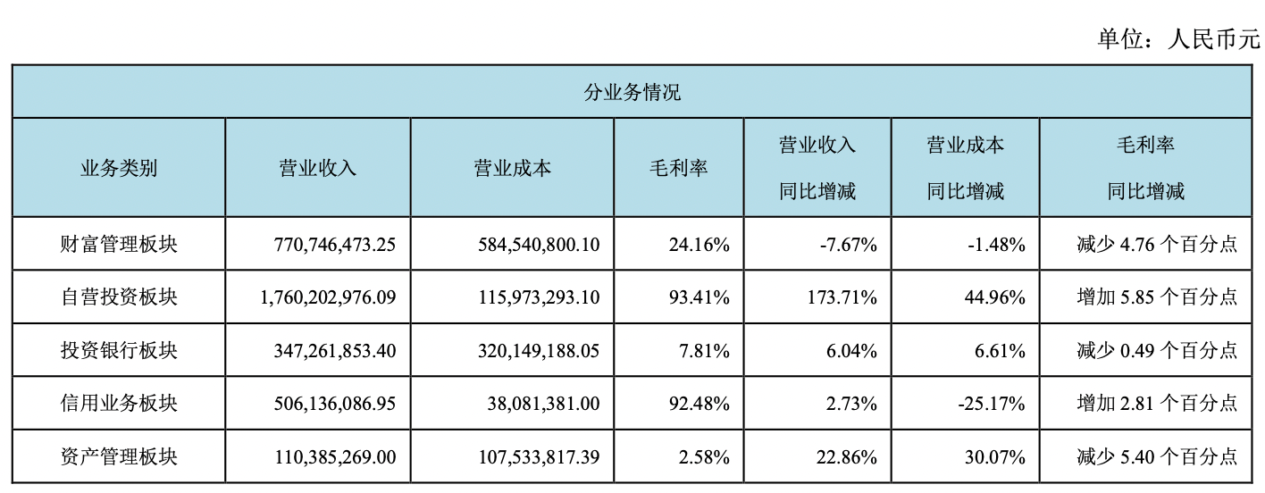 2023年,西部证券的“自营投资”“投资银行”“信用业务”“资产管理”等多个业务板块均实现了营收增长。其中“自营投资”板块业务营收同比增幅最大,全年营收17.60亿元,同比增长173.71%,该业务板块的毛利率在2023年也增加了5.85个百分点。