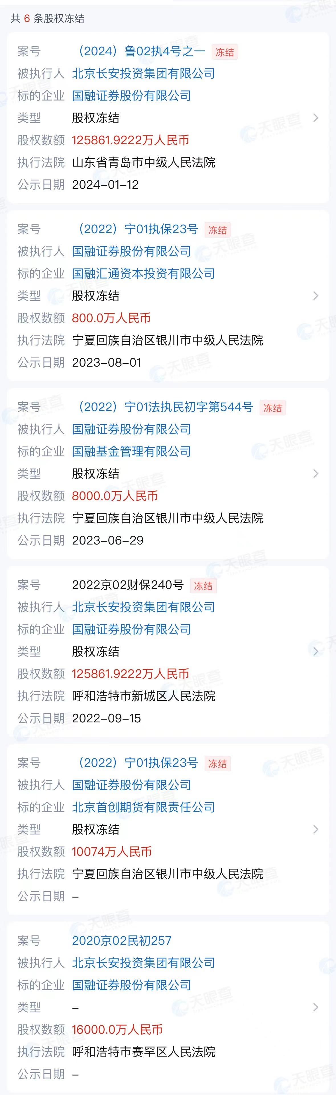 值得注意的是,数据显示,长安投资集团旗下所持有的国融证券及间接持有的国融基金、国融汇通资本投资有限公司等机构股权仍然处于司法冻结状态。据了解,股权被冻结的原因,系长安投资集团此前与国融证券中小股东的对赌国融证券上市失败所致,触发了长安投资高达逾20亿元的对赌回购债务。
