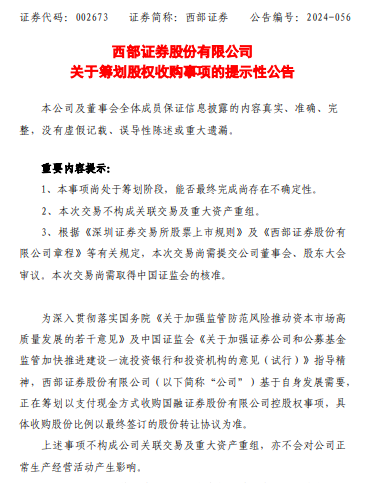 总的来看,西部证券收购国融证券彰显了其做大做强、提升综合竞争力的决心。在金融市场竞争日益激烈的背景下,合并已成为中小券商"弯道超车"的重要途径。与此同时,随着中央金融工作会议提出"培育一流投资银行和投资机构"的目标,以及证监会鼓励头部券商通过并购重组等方式做优做强,未来头部券商的整合大戏也有望陆续上演。西部证券的"买买买"只是一个开始,券商业正酝酿更大的变革。