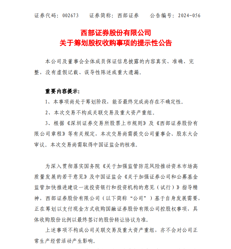 有媒体报道,据接近国融证券的业内人士透露,西部证券对国融证券的收购尽职调查工作在2024年4月就已经全面展开,相关准备工作已经进行了一段时间。