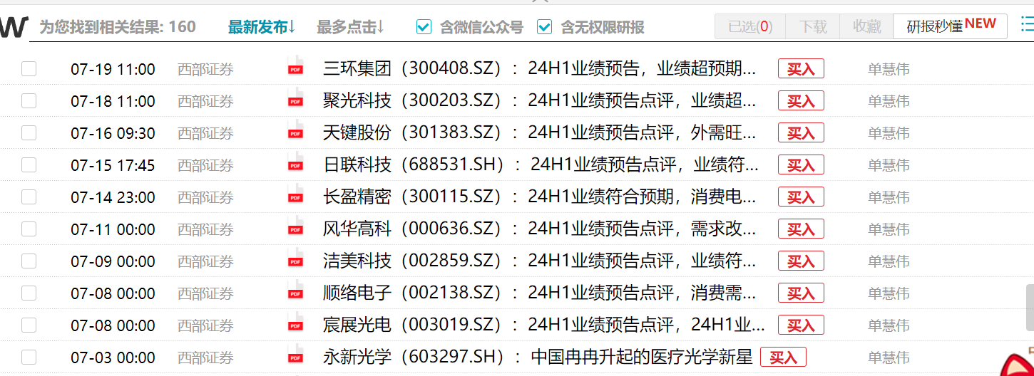 单慧伟作为西部证券电子行业首席分析师,7月的研究重点在于所覆盖公司的半年报业绩预告。Wind资讯数据显示,至7月19日,他共计发布了10家上市公司的业绩预告点评,包括三环集团、聚光科技、日联科技等,评级全部是“买入”。