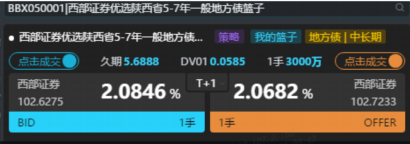 西部证券作为陕西当地券商,凭借陕西地方债在团,做市人员配备完善等优势,立足区域特点,深耕陕西地方债,推出“西部证券优选陕西省5-7年一般地方债篮子”(篮子代码:BBX050001)。该篮子于5月20日正式上线,已经与多家银行投资者达成交易。西部证券根据市场需求变化持续为投资者提供灵活高效的双边报价服务,促使篮子成交价维持在估值附近,更好地满足了投资者的配置交易需求,同时提升了陕西地方债的流动性和吸引力,为当地债券市场高质量发展赋能,为推动中国式现代化金融市场的蓬勃发展贡献力量。