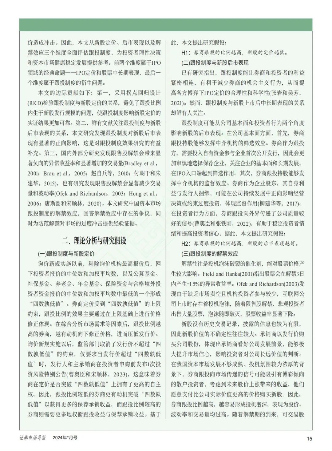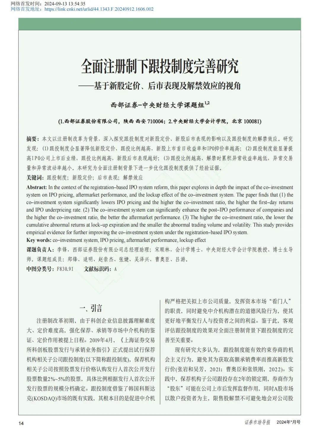 近日,西部证券在《证券市场导报》2024年第9期刊发理论研究文章《全面注册制下跟投制度完善研究——基于新股定价、后市表现及解禁效应的视角》。该文章在全国中文核心刊物上发表,是西部证券持续深化理论研究、打造学习型组织的一项重要成果,为资本市场的健康发展贡献了智慧与力量。