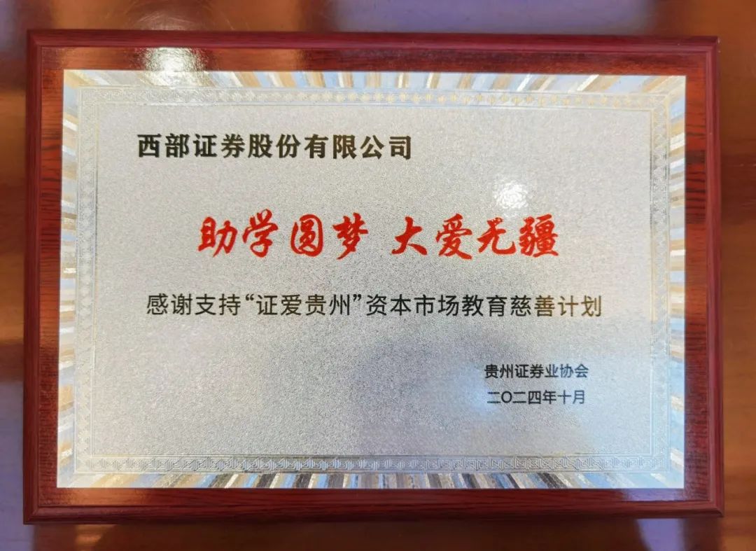 为激励莘莘学子奋发进取,鼓励教育工作者“稳岗重教”,贵州省证监局、贵州省证券业协会、华能贵诚信托以及各资本市场主体等机构以“奖教奖学,励志育人”为宗旨,联合发起设立“证爱贵州”资本市场教育慈善计划,定向用于奖励和表彰品学兼优的学子和教育教学工作突出的教师。西部证券作为国有控股金融企业,为更好推动地区教育事业发展,以及更好履行国有企业社会责任与使命担当,积极响应贵州省证券业协会号召,捐赠资金50万元参与了“证爱贵州”资本市场教育慈善计划。教育兴则国兴、人才强则国强,慈善助学作为教育帮扶的一项重要环节,对进一步构建和谐社会,实现中华民族伟大复兴具有积极而深远的意义。