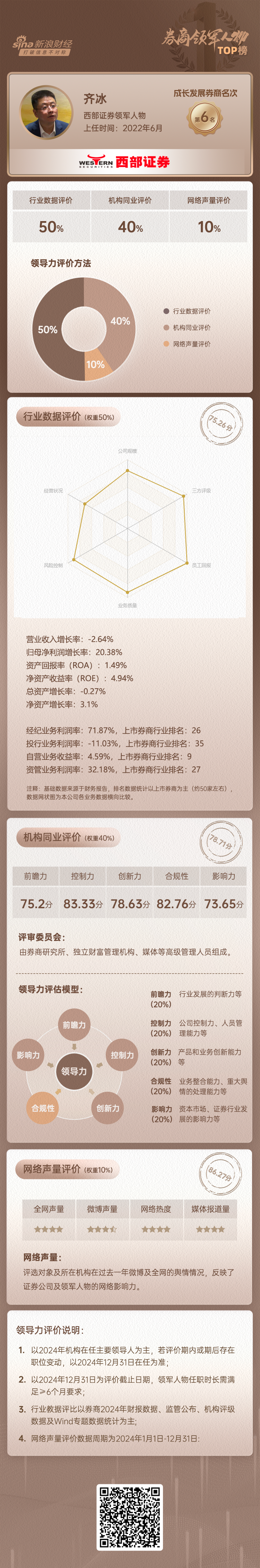 近日,新浪财经首届上市券商领军人物领导力TOP榜结果出炉,西部证券总经理齐冰荣获成长发展券商第6名。