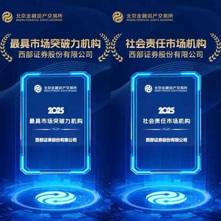 近日,西部证券荣获北京金融资产交易所2025年度“最具市场突破力机构”和“社会责任市场机构”奖项,连续两年荣膺此殊荣。