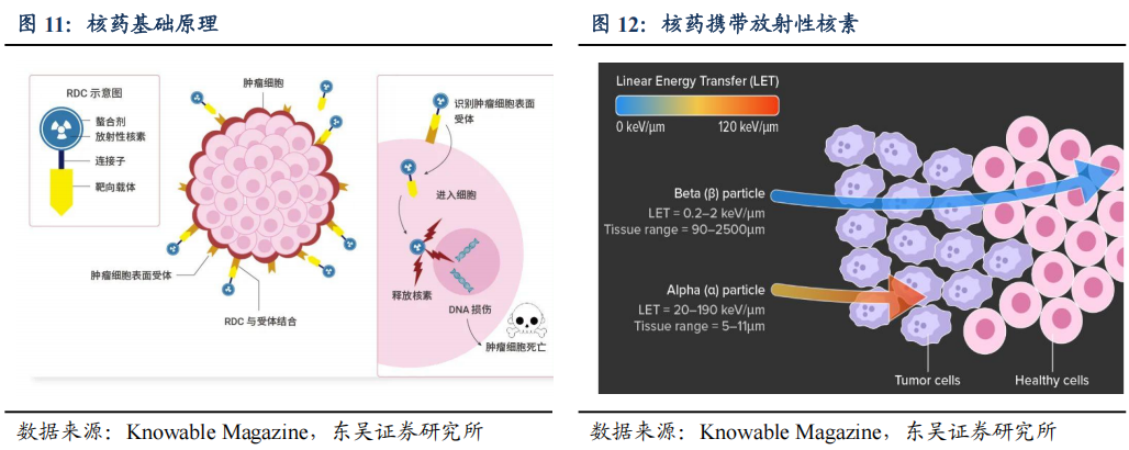 放射性核素偶联药物(RDC)是一种结合了精准靶向和强效杀伤优势的新型诊疗药物。核药/放射性药物,是指放射性同位素制剂或用放射性同位素标记的一类特殊医学药物。与肿瘤放射治疗不同,核药可以在需要治疗部位由内而外发生的辐射,而放疗则是由外向内输送的辐射。在给予相同辐射剂量时,核药可以更直接的针对靶向部位。RDC通过连接子及螯合剂将放射性核素与配体(如抗体、多肽、小分子等)结合,靶向载体识别肿瘤细胞后将携带的核素运输到靶细胞的位置,实现在分子层面早期且特应地诊断疾病,或者针对癌症治疗中的肿瘤组织给予高于健康组织的辐射剂量,因而在心血管疾病、神经退行性疾病的诊断、以及恶性肿瘤的治疗和疗效评估等方面发挥着重要作用。