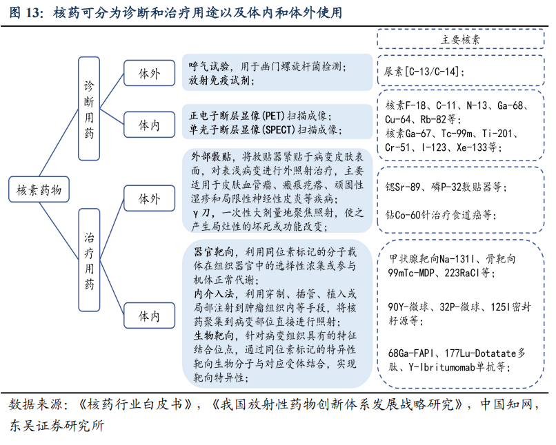 核药可按使用方式分为体外和体内两类,也可按临床用途分为诊断类和治疗类。体外核药主要指放射性同位素标记的免疫诊断试剂,也包括体外敷贴器和γ刀等治疗手段;体内核药可按具体用途分为诊断用核药与治疗用核药。诊断类核药是用于获得体内靶器官或病变组织的影像或功能参数,可用于体检筛查、疾病诊断、器官结构/功能评估和患者管理。治疗类核药将具有细胞毒性水平的放射性核素选择性地输送到病变部位,利用放射性核素的衰变特征释放射线或粒子对病变细胞产生杀伤作用,从而达到治疗目的。