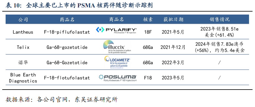 RDC是目前临床实操中唯一能够实现诊疗一体化的药物。RDC的特点在于可以只更换核素部分,相关的靶头和linker都保持相似的情况下,就能够形成诊疗一体化的产品。比如根据核素特性,连接氟[18F]、镓[68Ga]等构成诊断产品,精准靶向的位置;连接镥[177Lu]、锕[225Ac]则构成治疗产品。从而实现研发成本节约,方便医生给患者精准用药,这也是目前临床实操中唯一能够实现诊疗一体化概念的领域。伴随诺华PSMA-RDC的上市且热卖,其诊断性核药的需求也随之提升。目前主要的PSMA示踪剂包括Telix、Lantheus、诺华、Blue Earth四家公司的产品。