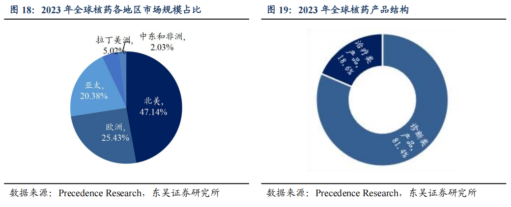 目前核药应用以北美、诊断类、肿瘤和心血管领域为主。从各地区市场规模分布情况来看,北美地区占据主导地位。根据Precedence Research,2023年北美市场规模达35.2亿美元,市场份额为47.14%;亚太市场占比20.38%,仍有强劲增长力。从细分市场产品结构来看,2023年全球诊断类核药占比81.4%,治疗类核药占比18.6%。从应用领域来看,核医学的主要市场是癌症和不同类型的心血管疾病,2023年肿瘤学领域占比41%,心脏病学应用领域占比23%。
