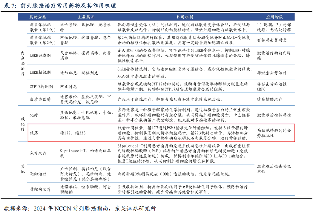Pluvicto(177Lu-PSMA-617):2022年3月获得FDA批准上市,用于三线治疗PSMA阳性转移性去势抵抗性前列腺癌(mCRPC),同时诺华已提交二线治疗的上市申请。与Lutathera不同的是,Pluvicto的药物配体是一种小分子PSMA抑制剂。Pluvicto上市后首个完整销售年便实现营收9.21亿美元,2024年实现营收13.92亿美元(+42.0%)。2024年9月,Pluvicto被我国CDE纳入优先审评。我们预计Pluvicto将于25-26年在中国大陆获批,我们判断,Pluvicto的上市销售将带来配套的核药网络运用需求。