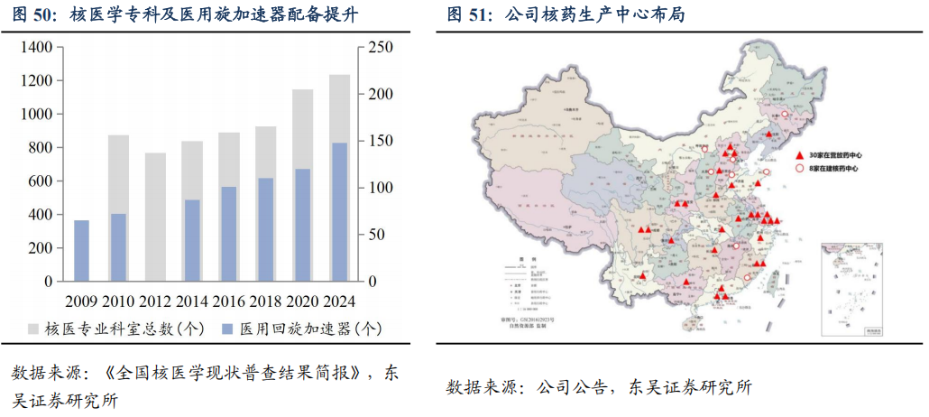 公司网络化覆盖区域较好,核药中心达30个。截至2024年报,公司已投入运营7个以单光子药物为主的核药生产中心,21个正电子为主的核药生产中心,2个其他运营中心。目前8个核药生产中心正在建设中,公司投入运营的核药相关生产中心已达30个,基本覆盖国内93.5%人口的核医学的需求。核药生产中心网络化生产布局的进一步完善成为公司发展的核心竞争力。