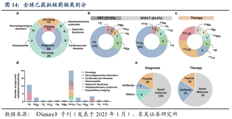 全球共64款核药,多用于诊断用现象以及肿瘤治疗,可开发领域尚多。根据弗若斯特沙利文总结,截至2023年10月,全球共有64款放射性新药获批上市,其中50款仅用于诊断、13款仅用于治疗、1款既用于诊断也用于治疗。中国共有42款放射性药物获NMPA批准上市,其中24款仅用于诊断、15款仅用于治疗、3款既用于诊断也用于治疗。其中,22款药物已纳入乙类常规医保目录。诊断用放射性药物主要为PET和SPECT显像药物,代表药物分别为氟[18F]脱氧葡糖和锝[99mTc]及其标记化合物。治疗用放射性药物主要针对肿瘤,代表药物包括碘[125I]密封籽源、氯化锶[ 89Sr]、氯化镭[223Ra]、钇[90Y]树脂微球。目前已上市的3款诊断及治疗用放射性药物均为碘[131I]化钠,用于诊断和治疗甲状腺疾病。