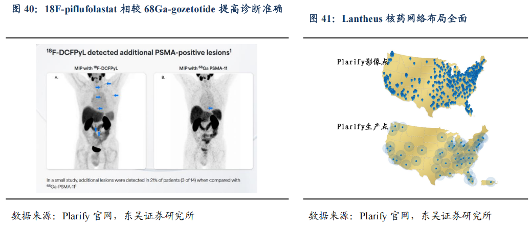 Lantheus的Plarify年销售额约9亿美元。Plarify(18F-piflufolastat)于2021年5月获得FDA批准,2022年作为上市后首个完整销售年实现营收5.27亿美金,2023年营收8.51亿美金(+61.45%)。根据《中国药物化学杂志》文献总结,18F-piflufolastat与68Ga-gozetotide在患者体内的分布情况相似;然而18F-piflufolastat相比而言的优势在于,1)拥有更长的半衰期,其允许延迟成像,允许注射放射性示踪剂后在不同时间点进行多次成像,从而可以更清晰地区分生理性摄取和病理性摄取,提高诊断的准确性;2)在前列腺癌复发患者中,其通过PET/CT显像检测前列腺小病灶的敏感度更高。