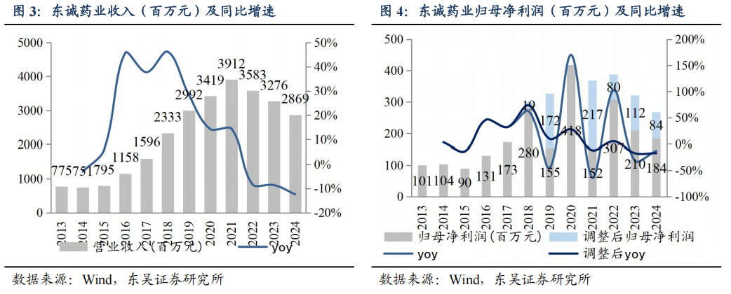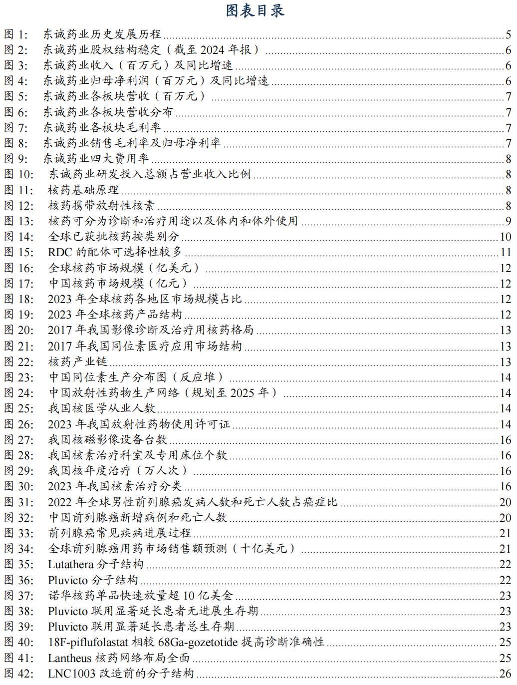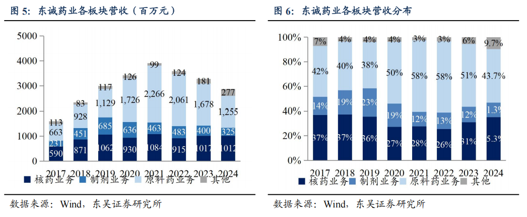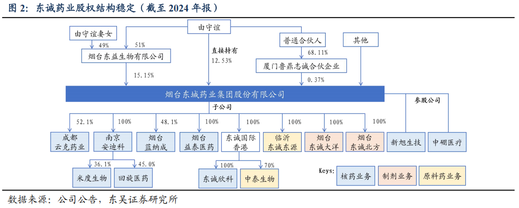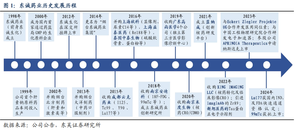 东诚药业是一家覆盖原料药、制剂、核医疗、大健康四大领域,融药品研发、生产、销售于一体的大型制药企业集团。发展历程阶段一、原料制剂一体化普药药企。公司前身东诚生化成立于1998年,主要生产肝素钠和硫酸软骨素,陆续并购烟台北方制药、烟台大洋制药,丰富化药及中药制剂管线;2012年东诚生化在深交所上市,2014年更名为“烟台东城药业集团”。二、切入仿创核药生产并丰富核医疗产业链平台。公司目标成为国内首个核医药上市公司平台,2015年控股国内排名第一的核素制剂生产企业成都云克药业,2016年控股东城欣科和益泰医药,2018年收购南京安迪科,丰富放射性药品产品线;同年并成立东城药业创新研究所对公司生化药、制剂及核药板块的研发资源进行整合,2019年收购广东高尚集团4家医学影像诊断中心,2020年收购南京米度生物科技,足以提供核药早筛到上市注册的一站式CRDMO服务。三、成为创新核药研发引领者。2021年成立烟台蓝纳成放射性创新核药研发平台;截至2024年底,创新研发工作取得突破性进展,已有核药新药正在进行III期临床,并有多款新药进入临床I期等阶段,适应症涵盖前列腺癌、胃癌、结直肠癌、鼻咽癌等多种癌症的诊断与治疗,达成多款核药的中国区独家权益合作,加强与礼来、GE医疗、新旭生技、北京肿瘤医院等合作,成为国内核医药行业的创新引领者之一。