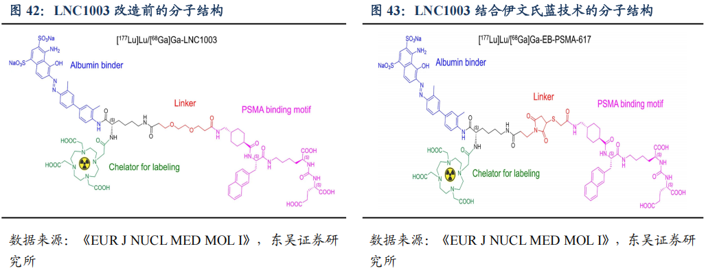伊文氏蓝技术提高肿瘤摄取量。177Lu-LNC1003与新加坡国立大学陈小元教授团队合作,利用伊文氏蓝(EB)白蛋白结合剂的技术,改变Linker结构,从而提高绝对肿瘤摄取和肿瘤吸收剂量,从而提高治疗效果。临床前研究表明,在荷瘤小鼠实验中,177Lu-LNC1003相比诺华的177Lu-PSMA-617,SPECT 成像与生物分布研究,都显示其具有更高的肿瘤摄取和保留。说明177Lu-LNC1003有潜力使用较低的剂量和更少的周期来提高治疗效果,有望于临床转化为治疗具有不同水平 PSMA 表达的前列腺癌患者。