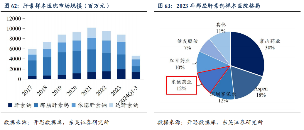 公司那屈肝素顺利进入国采,新上市依诺肝素和达肝素制剂,借助原料药制剂一体化优势拓充产品品类。低分子肝素主要包括那屈肝素、依诺肝素、达肝素。根据开思数据库,2023年肝素市场约为88.04亿元,低分子肝素市场68.59亿元,那屈肝素、依诺肝素、达肝素分别占低分子肝素市场比34.8%、40.8%、24.4%;公司的那屈肝素钙在其同通用名市场的市占率为12%。2023年第八批国采,那屈肝素和依诺肝素的原研厂家Aspen和Sanofi均未中标;那屈肝素注射剂共有4家企业中标,公司的中标价格为15.68元/支。公司在肝素原料药领域拥有广泛的国际市场认证、许可优势、客户资源和销售网络优势,肝素钠原料药已顺利通过美国FDA现场审核、欧盟EDQM的CEP认证、德国汉堡的GMP认证,日本PMDA证书等。依托肝素垂直一体化的原料药优势,向下游制剂延伸拓展,提升市场占有率,树立抗凝细分产品知名品牌地位。