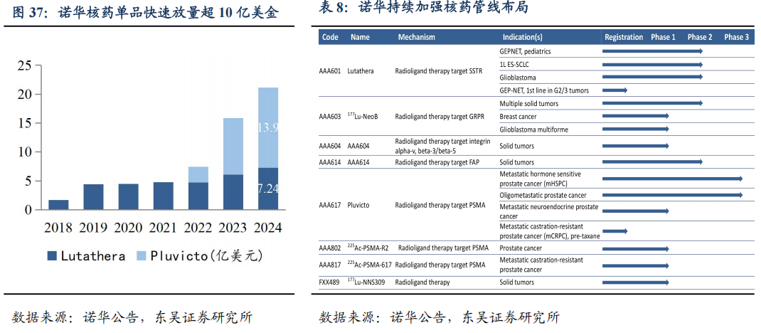 全球龙头诺华持续加强核药领域收并购,并率先实现核药商业化放量。诺华早于2017年斥资60亿美元先后收购了法国创新药公司Advanced Accelerator Applications(AAA)和美国生物制药公司Endocyte,并以此为基础布局核素药物技术平台;2024年与PeptiDream签署了总价值约29亿美元的合作协议,共同开发多款大环肽靶向偶联核药;又以10亿美元预付款及7.5亿美元的潜在里程碑付款收购Mariana Oncology,加强放射性配体疗法的布局。目前,诺华已有两款核药Lutathera和Pluvicto获批上市,并通过连续投资及授权合作,诺华已储备了较多核药管线,包括6个临床1期的管线。