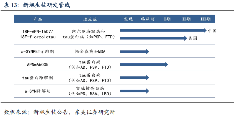 Tau蛋白成像剂8F-APN-1607已经完成III期临床观察。新旭专注于AD、帕金森症等神经退行性疾病的放射性核素诊断与治疗药品的研发。其中,18F-APN-1607(18F-florzolotau)是用于PET影像诊断类药物tau蛋白正电子摄影示踪剂,能够与脑内积蓄的Tau蛋白进行特异性结合从而实现早期与晚期的AD诊断,已有超过2000位患者的临床验证,获FDA认定为“孤儿药”。18F-APN-1607于2019年11月在美国、中国台湾和日本启动了II期多国多中心临床,2020年10月在中国获批III期临床,2023年12月获得FDA批准开展III期临床;截至2024H1,已完成III期临床观察,正处于统计分析与总结阶段。