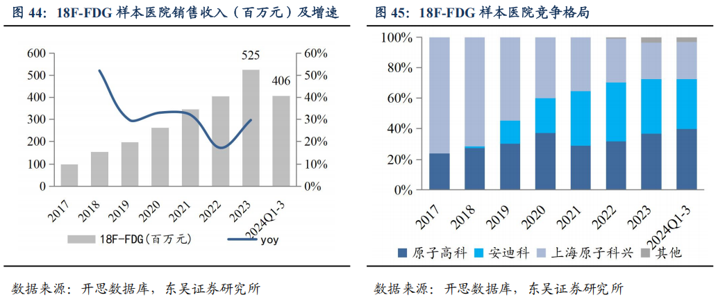 18F-FDG市场规模5亿元,CAGR达30%,公司市占率30%。随着PET-CT在肿瘤及神经退行性疾病的诊断与治疗的作用越来越明显,18F-FDG市场规模保持快速增长。根据开思数据库,2023年18F-FDG样本医院销售额5.25亿元(+29.6%),2017-2023年CAGR为31.8%。国内只有三家主要的生产厂商,竞争格局较好,公司全资子公司安迪科的2023年样本医院市场份额为32.8%,在扩容市场中保持稳定份额。我们预计未来随着国内PET-CT配置数量增加,市场规模有望进一步扩大。