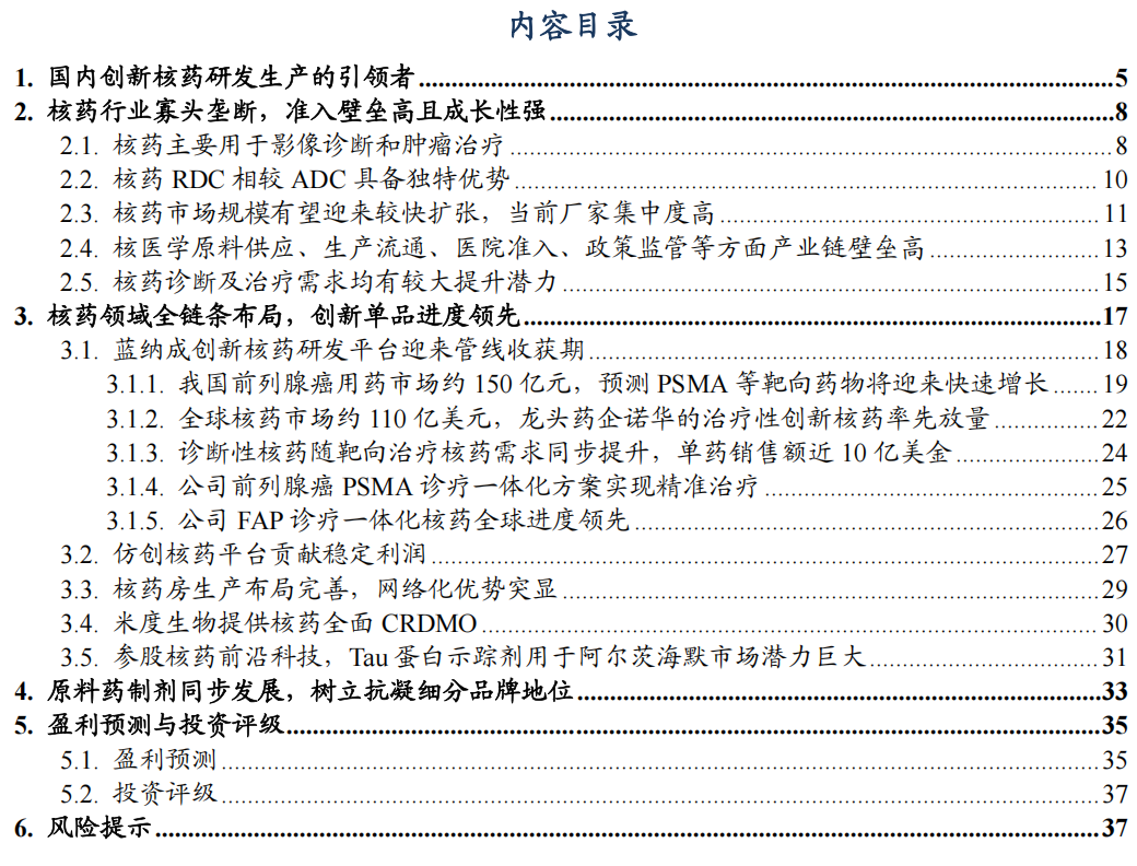 | 投资要点主业稳定向上+核药产业链进入收获期:原有业务肝素原料药价格于2024年见底,预期2025-2027年将会贡献稳定收益。自2015年公司通过收购云克、安迪科,成立创新核药蓝纳成,造就核药全产业链网络。公司近30家核药房投产,大规模资产开支基本结束,一方面是诺华等核药在医院放量的关键端口,另一方面蓝纳成创新诊断及治疗核药进入收获期,将给公司带来巨大业绩弹性。核药行业需求扩容,双寡头供应格局稳定:RDC核药相较ADC,配体可选择性更多,无需细胞内吞或断裂连接子,也无需特定抗原识别,具备独特治疗与安全性优势。核磁影像硬件设备增加,核药治疗医疗环境提升,核药产业政策扶持等产业机会多。根据Precedence Research,2023年全球核药市场规模为107亿美元,2024-2033年CAGR为11.5%;并根据弗若斯特沙利文测算,2023年我国核药市场规模约50亿人民币,2021-2025年CAGR为32.4%。核药领域竞争环境较好,因为核医学原料供应、生产流通、医院准入、政策监管等方面产业链壁垒高,格局较为稳定。对标海外影射,公司核药产业全链条网络化供应优势突显:诺华自2017年起通过连续收并购成为核药龙头,率先实现核药商业化且放量迅速。两款标志性治疗性靶向核药Pluvicto和Lutathera,分别于2022年和2018年获FDA批准上市,便快速于2024年分别实现营收13.92亿美元(+42.0%,括号内为同比增速,下同)和7.24亿美元(+19.7%)。伴随治疗性核药放量,配套的诊断核药示踪剂需求同步飞升。两款标志性产品均于2021年上市,Plarify于2023年营收8.51亿美元(+61.45%),Illuccix于2024年营收5.4亿美元(+56%)。估算21亿美元的治疗市场约对应14亿美元的诊断市场,诊断性核药市场亦不容小觑。Pluvicto于2024年9月被我国CDE纳入优先审评,其将于25-26年在中国大陆获批上市。公司创新核药平台管线收获期,核药研发进度领先:公司核药拥有多款全球自主知识产权的核药靶向药,包括PSMA、FAP、αvβ3等多个靶点,均为治疗和诊断配套的一体化精准治疗。我们判断将在近3年贡献商业化收益:①锝标替曲膦已于2024年获批上市;②氟[18F]化钠显像剂已经完成III期临床,正处于上市申报阶段;③99mTc-GSA和阿法肽(18F-αvβ3)已经完成III期临床试验,并进入NDA申报阶段流程;④思睿肽注射液(18F-PSMA)已于2023年11月进入III期临床试验。因此我们判断,今明年将步入公司管线收获期;伴随新药品种的销售放量,协同利用公司成熟的核药网络体系,公司将打开更大市场空间。盈利预测与投资评级:预计 2025-2027年,公司营业收入分别为32.2/37.1/41.9亿元,归母净利润为2.2/3.2/4.0亿元,对应当前市值的PE为50/34/27倍。考虑公司创新核药管线进入收获期,核药网络化供应能力强,同时通过原主业肝素类产品贡献稳定利润,我们判断公司当前创新属性尚未完全体现,首次覆盖,给予“买入”评级。风险提示:新药研发进展不及预期,核药政策改革,汇率波动,肝素原料药采购及价格波动,以及折旧增加导致业绩下滑的风险。 |