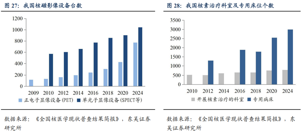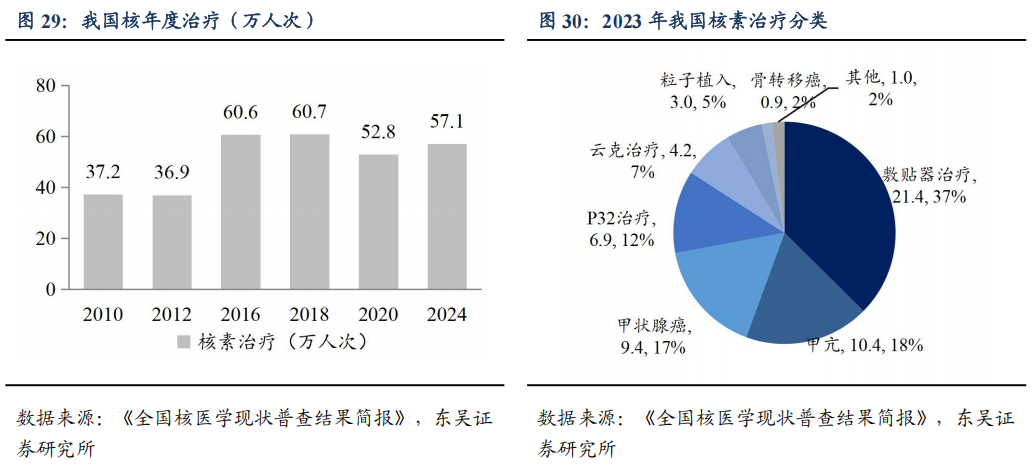 核素治疗人次及药物治疗需求提升。根据《全国核医学现状普查结果简报》,2024年我国核素治疗科室数量达801个,专用病床2993张,2015-2023年专用病床张数CAGR为9.0%。2023年核素药物总治疗数量为57.1万例次,治疗项目以Sr90/Y90敷贴器治疗、I131治疗格雷福斯甲亢、I131治疗分化型甲状腺癌、P32敷贴器治疗、东诚药业的云克治疗类风湿关节炎为主。该《简报》仅统计了我国核素治疗科室的药物使用人次,核素类药物仍在对应适应症科室及肿瘤科等其他科室使用,实际治疗人数高于《简报》。