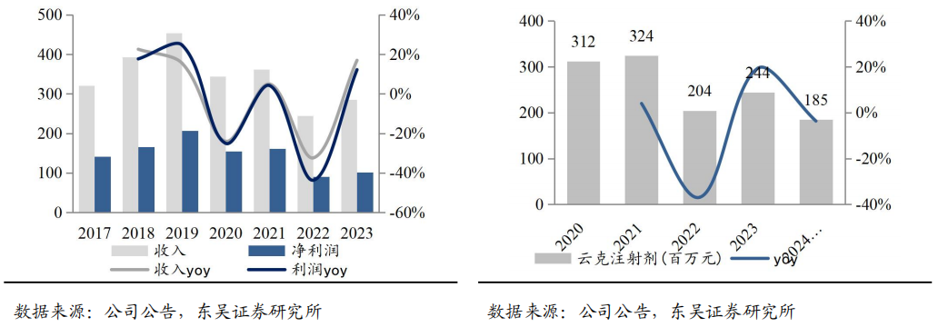 云克注射剂是云客药业独家创新产品,市场规模2.4亿元。2023年实现营收2.44亿元(+19.3%)。2022年云克收入下降,除疫情影响外主要系云克原先在部分省份被列入地方医保,而陆续执行国家医保目录后原先省份无法再进行医保报销;2024Q1-3同比减少主要受 DRG、DIP政策影响,住院病人减少所致。考虑同类竞品的患者自费比例,以及云克的有效性、安全性及多年来形成的患者粘性,预计云克销量较为稳健。