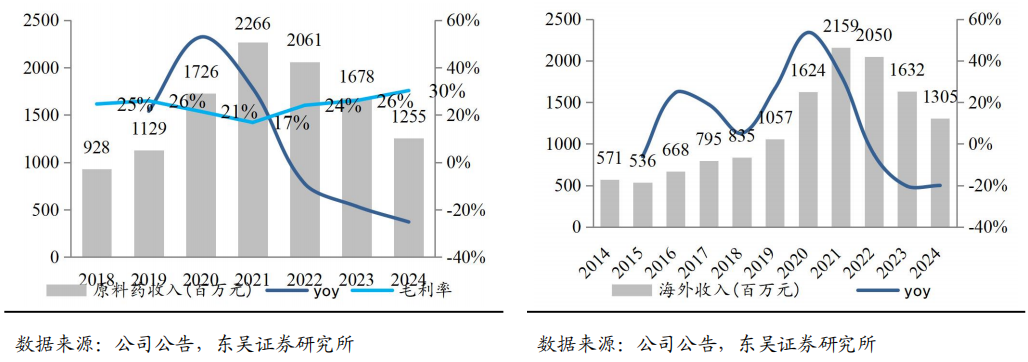 公司原料药及出海业务稳健增长,毛利率升至30%。公司是肝素API生产商和硫酸软骨素(药品级和膳食补充剂级)的全球供应商,销售网络遍布全球40多个国家和地区,在生化原料药行业内拥有领先地位。公司原料药业务营收90%源于海外,原料药板块维持稳定在25-30%毛利率,海外收入增长较快,2024年海外营收12.6亿元(-20.0%),近两年的业绩下滑主要系需求及库存周期性压力,2018-2024年CAGR为7.7%。