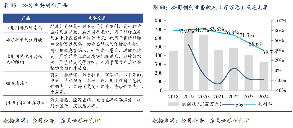 公司依托原料药优势,向下游制剂一体化及新型抗凝产品拓展。公司制剂产品管线丰富,拥有年产7000万支的冻干粉针剂生产线、水针生产线及多条固体制剂生产线(片剂、胶囊剂、颗粒剂、软胶囊剂、滴丸剂),产品全面覆盖抗凝、心血管、抗肿瘤、泌尿、骨科及抗感染等多个治疗领域。2024年,公司制剂业务营收3.25亿元(-18.7%),毛利率39.7%;业绩和毛利率下滑主要系那屈肝素钙进入第八批国采,带来销售价格下降。