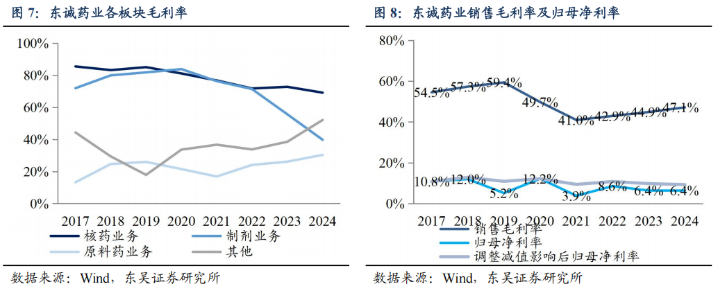 盈利企稳。2024年,公司实现营收28.69亿元(-12.4%,括号内均为同比增速,下同),归母净利润1.84亿元(-12.3%)。2015-2021年,自公司切入核药领域,营收利润增长较快,期间营业收入CAGR为30.4%,归母净利润CAGR为9.1%。净利润波动系2018年计提应收账款坏账,2019年、2021年和2022年计提大洋制药和中泰生物商誉减值,2023年计提原料药存货跌价,2024年计提益泰医药商誉减值。还原资产减值损失影响后,2015-2021年归母净利润CAGR为26.6%。2022-2024年,受到疫情、那曲肝素钙国采降价、以及全球肝素需求低迷的影响,收入端增速下滑。我们判断,2025年起国采和疫情影响出清,创新性核药逐步进入管线收获期,公司将迎来业绩回升。