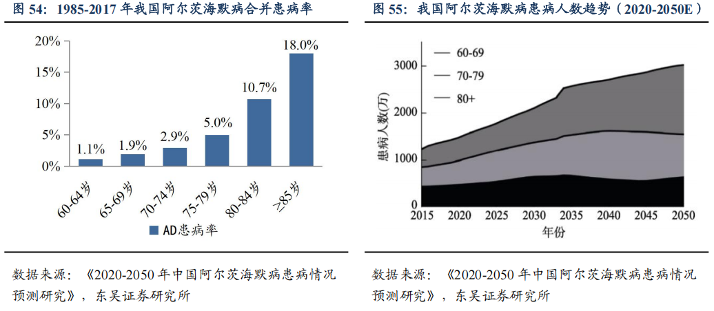 阿尔茨海默病(AD)随老龄化进程患病人群超千万。AD是一种起病隐匿的进行性发展的神经系统退行性疾病。临床上以记忆障碍、失语、失用、失认、视空间技能损害、执行功能障碍以及人格和行为改变等全面性痴呆表现为特征,病因迄今未明,65岁以后发病者,也被称为老年性痴呆。我国人口老龄化严重,AD越来越成为困扰我国的重要社会问题。根据《2020-2050年中国阿尔茨海默病患病情况预测研究》结果显示,中国1985-2018年60岁以上老年人AD的合并患病率达3.9%,其中80岁以上老人合并患病率高达10.7%;随着中国老年人口的增加,预计未来30年我国AD患病人数持续增长,2030年将超过2000万人,2050年将超过3000万人。