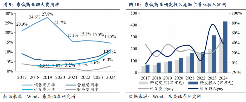 公司高度重视创新研发工作。自2021年成立蓝纳成核药研发平台以来,公司不断加大研发创新投入,扩大研发团队。截至2024年报,公司研发人员规模达480人,占总员工人数的19.4%。研发投入逐步增多,主要系药品研发项目逐步增多,且在研产品管线陆续进入相应的里程碑阶段或节点。2024年,研发投入总额4.31亿元(+37.7%),其中资本化投入1.40亿元(+20.6%),费用化支出2.91亿元(+47.7%)。