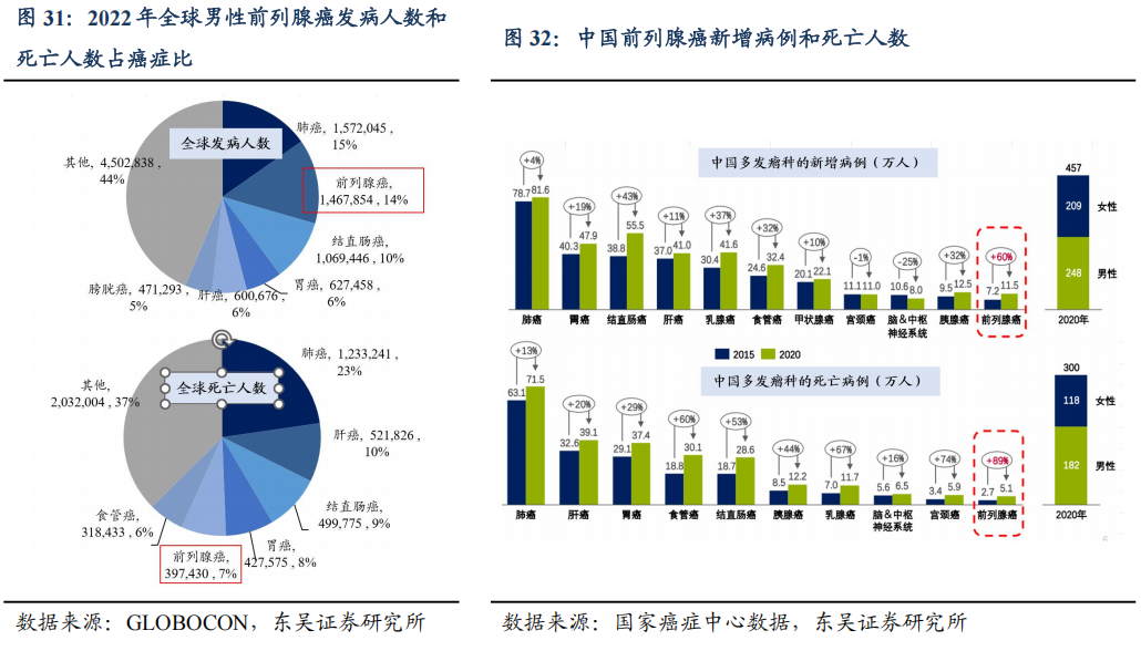 前列腺癌发病率及死亡率较高。根据WHO发布《全球癌症流行病学报告(2024年)》,2022年全球男性前列腺癌发病率达14.2%,位居第二;全球男性死亡率7.3%,位居第五。根据《中华肿瘤杂志》,2022年我国新发前连腺癌患者13.42万例,约占全部男性恶性肿瘤的5.30%,中标率为9.81/10万人;2022年因前列腺癌死亡病例约4.75万,占全部男性恶性肿瘤死亡的2.92%,中标率为3.21/10万人。根据摩熵医药统计中国国家癌症中心数据,2015-2020年,其中前列腺癌新发病例增长60%,死亡病例增长89%,是肿瘤患者人数增加最快的瘤种之一。